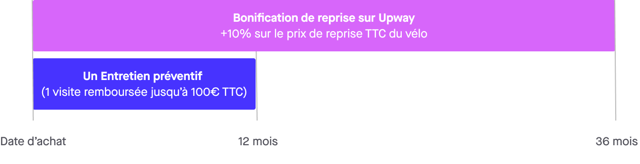 - une bonification de reprise (+10% sur le prix de rechat TTC du vélo, hors accessoires, si revente via Upway dans les trois années suivant l'achat)